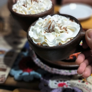 Especialidade: Chocolate quente na xícara de barro, bolos, salgados e cuscuz recheado.